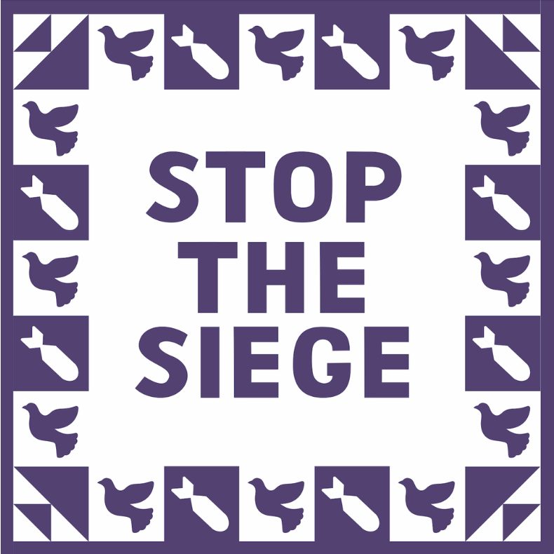 Backdrop to the speakers was an heirloom Mennonite child’s quilt, marked with bloody footprints to represent the many thousands of Palestinian children killed, maimed, and orphaned. The blood stained quilt also shows Christian complicity in settler colonialism, and the possibility for love and solidarity in walking in the Way of Jesus with the children and people of Gaza.