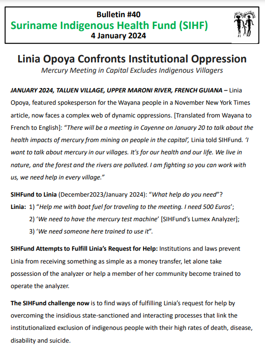 In the beginning we benefited from our anonymity and were disregarded as insignificant. Over time, our dedication to the Wayana people project and our efforts to equip them with the tools to participate in the research they needed to advocate for themselves has, over time, led to sanctions by government officials at the national and international and supranational level who believe that these activities are the sole domain of government sanctioned experts. This bulletin communicates the latest encounter with censorship and SIHF's efforts to use socially, morally, ethically and technically feasible methods to circumvent and overcome health justice obstacles. I welcome your comments, questions, and suggestions.