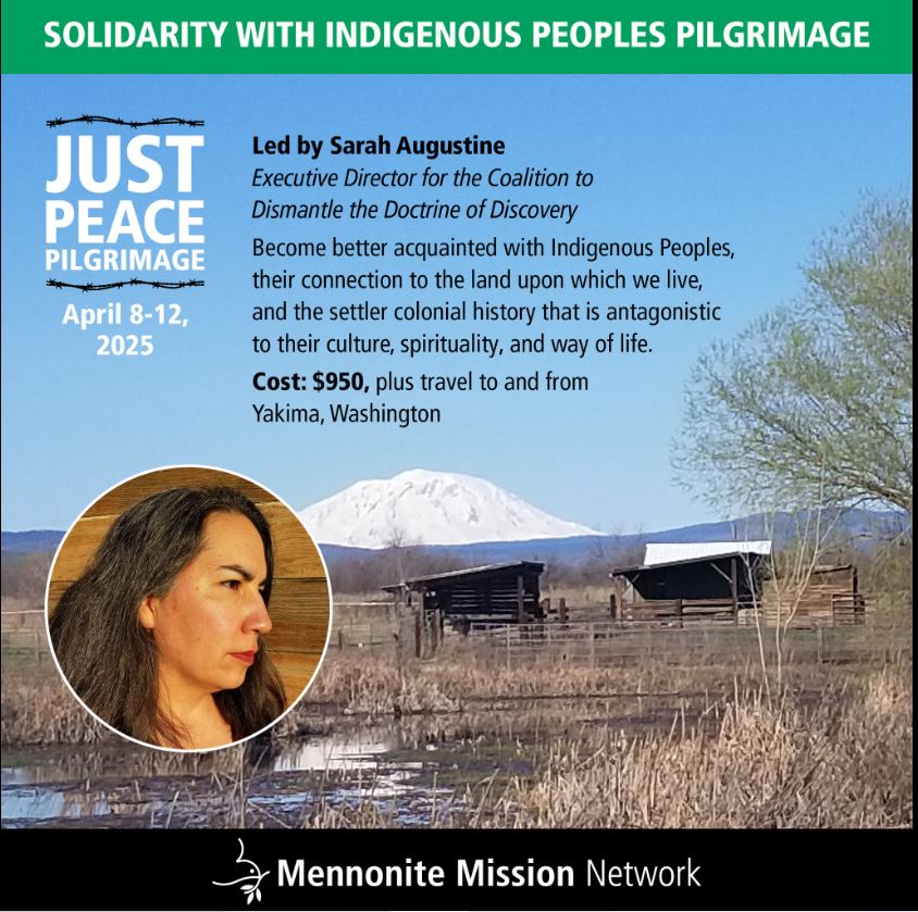 Join the Just Peace Pilgrimage: Solidarity with Indigenous Peoples led by our Executive Director Sarah Augustine. From April 8-12, travel to Yakima WA to become better acquainted with Indigenous Peoples, their connection to the land they live on, and the harms of settler colonialism. Cost: $950 plus travel