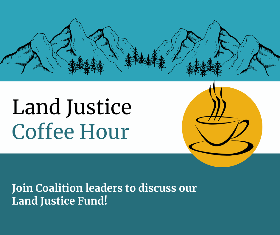 Join Coalition leaders by Zoom on Monday Dec 1, from 4-5pm PT / 5-6pm MT / 6-7pm CT / 7-8pm ET, to have your questions about the land justice fund answered. Bring a hot beverage of your choice! Open to anyone who wants to join. |