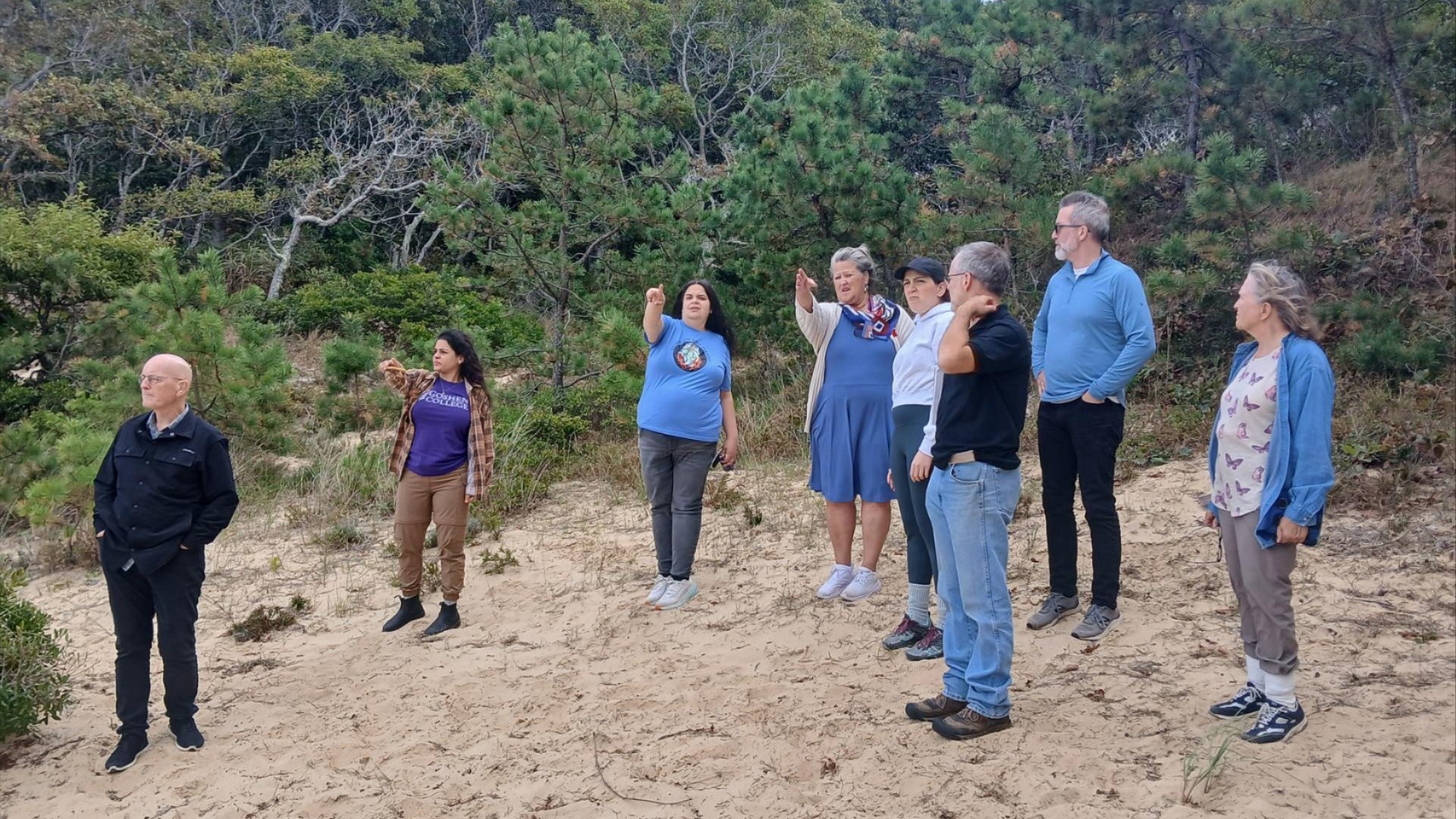 Members of the delegation and our Shinnecock hosts (Tela and Holly) on Westwoods, land that is part of a lawsuit filed by Southampton Left to right: Bishop Pat Bell, Alicia Maldonado-Zahra, Tela Troge, Holly Thompson, Elizabeth Yepez, Jon Zirkle, Matthew Carlson, and Sue Bartholomew |