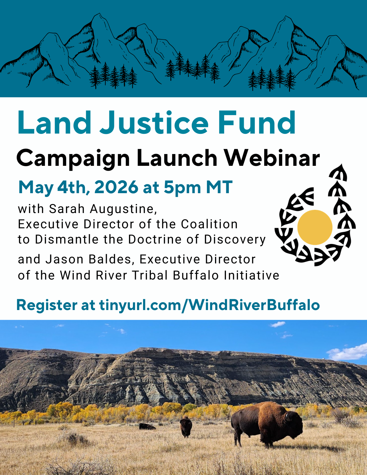 The Land Justice Fund invites you to a webinar celebrating the launch of its newest campaign, which will support buffalo restoration and land rematriation on the Wind River Indian Reservation in Wyoming! |